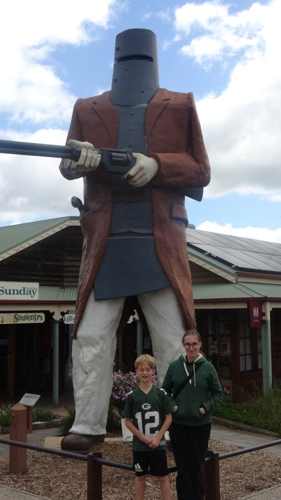 Jedna místní historická osobnost v Glenrowan je Ned Kelly; představte si Robin Hooda, akorát s puškou a tlustým železným domácím brněním, které dokáže zastavit kulku. Zrovna u Glenrowan ho zatkli a pověsili, a to hlavně díky tomu, že se někomu konečně podařilo střelit ho do nohy. Mají tam jeho sochu a pár atrakcí o něm.